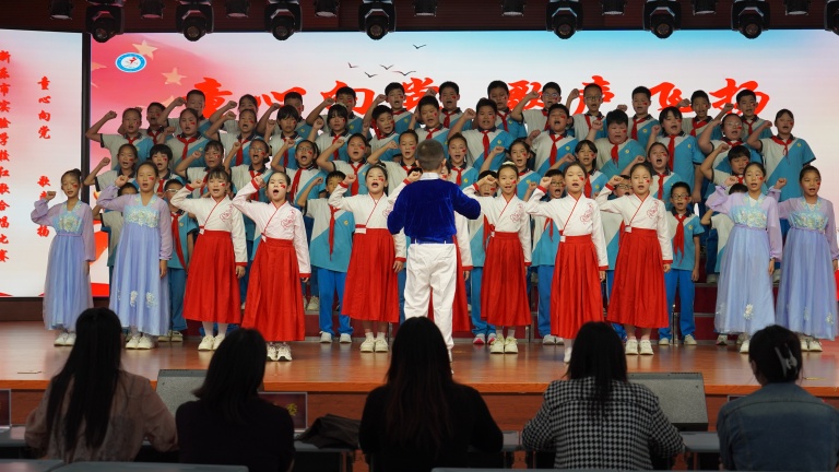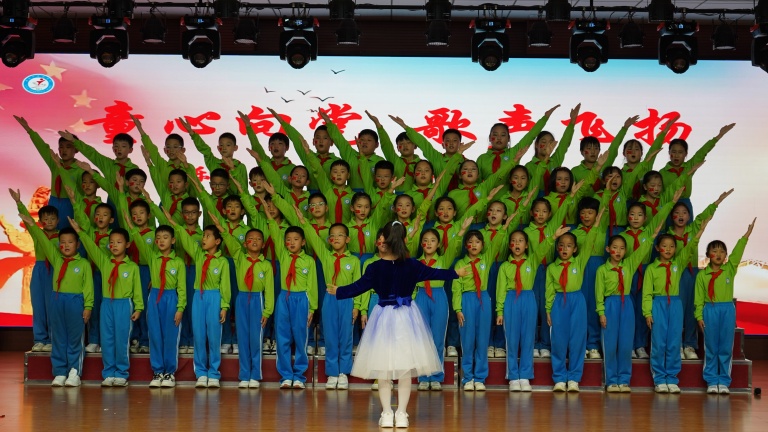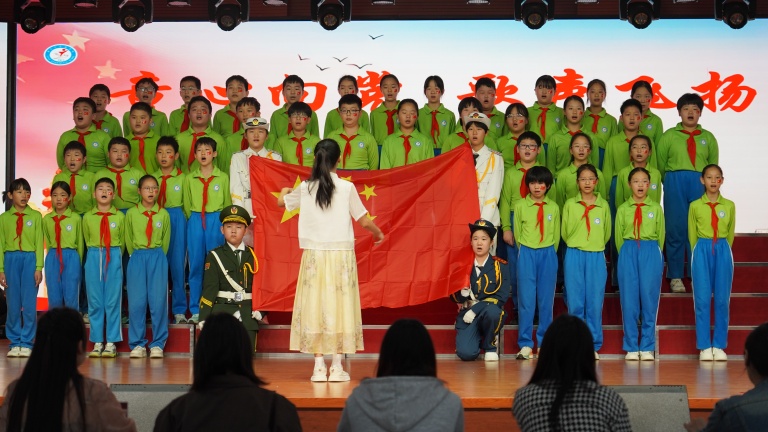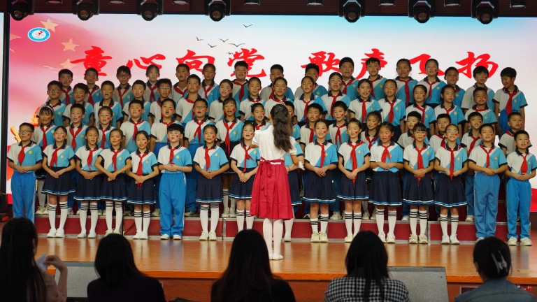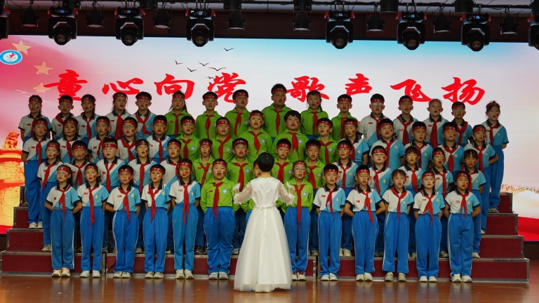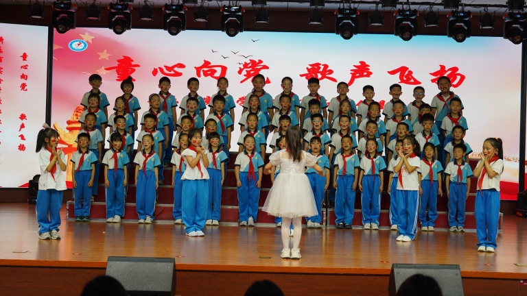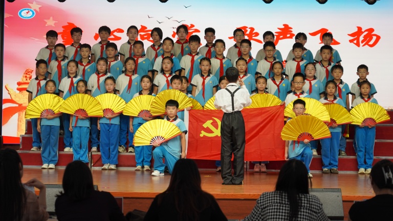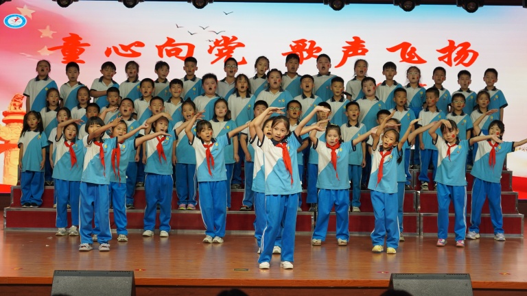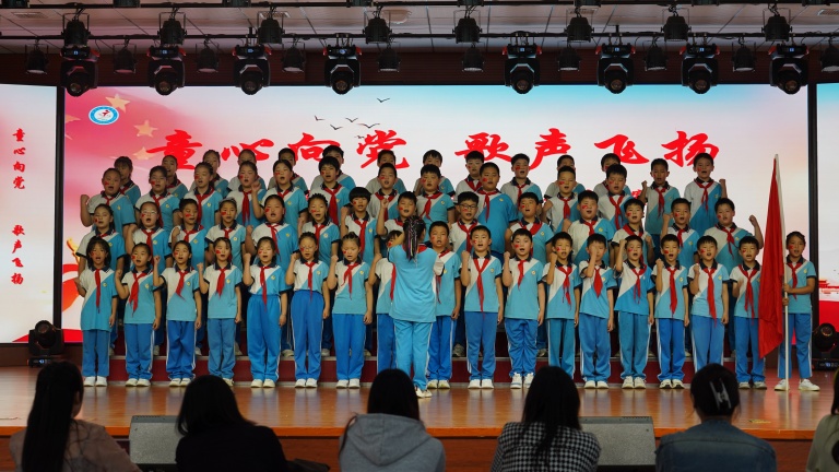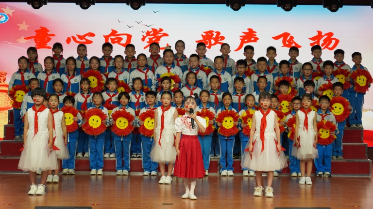 五、六年级学子以必选曲目《没有共产党就没有新中国》拉开序幕,歌声铿锵有力、气势昂扬;自选曲目环节,《中华少年》《国家》《卢沟谣》等歌曲轮番唱响,学子们精神饱满、眼神坚定,整齐的服装与默契的配合赢得现场阵阵掌声。