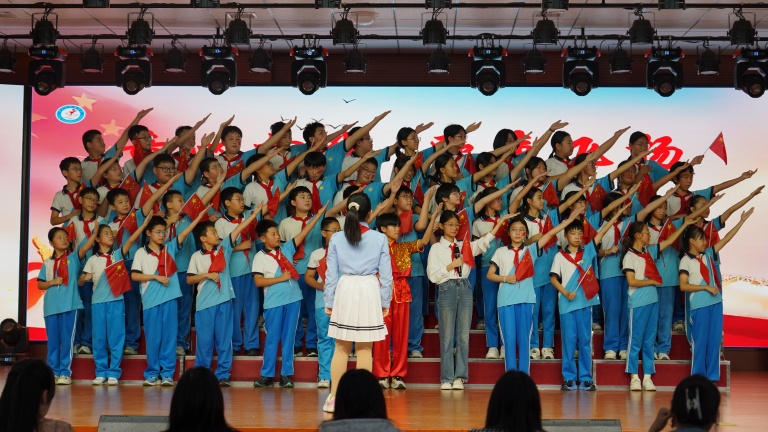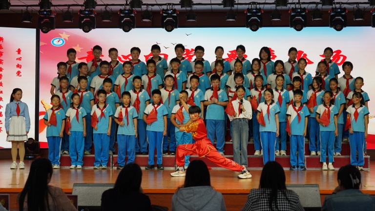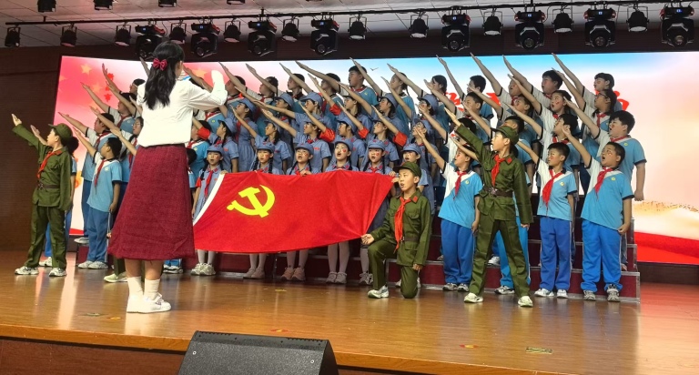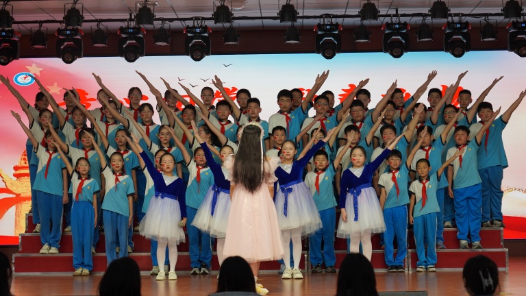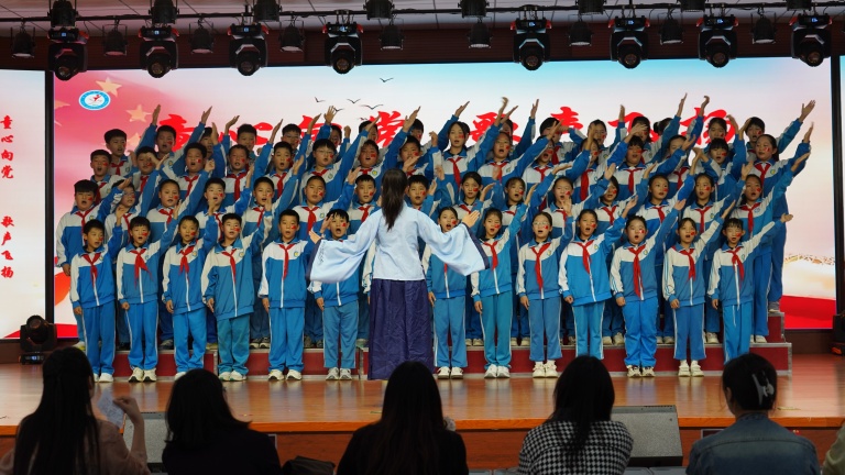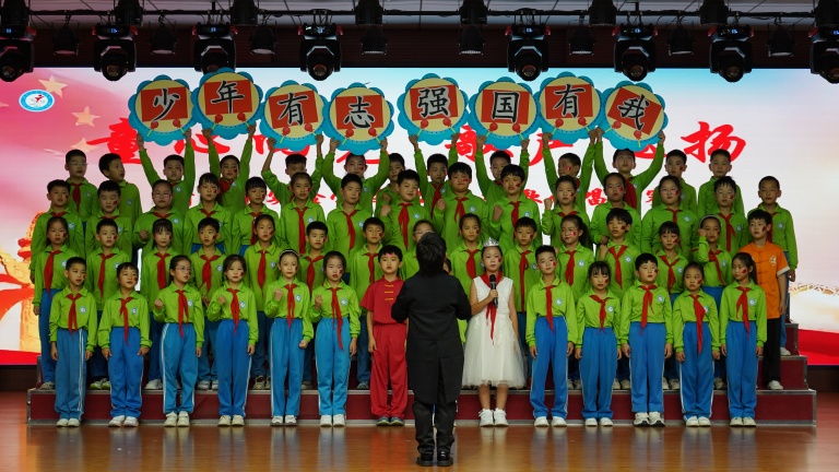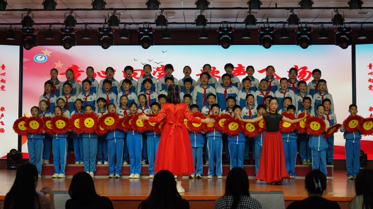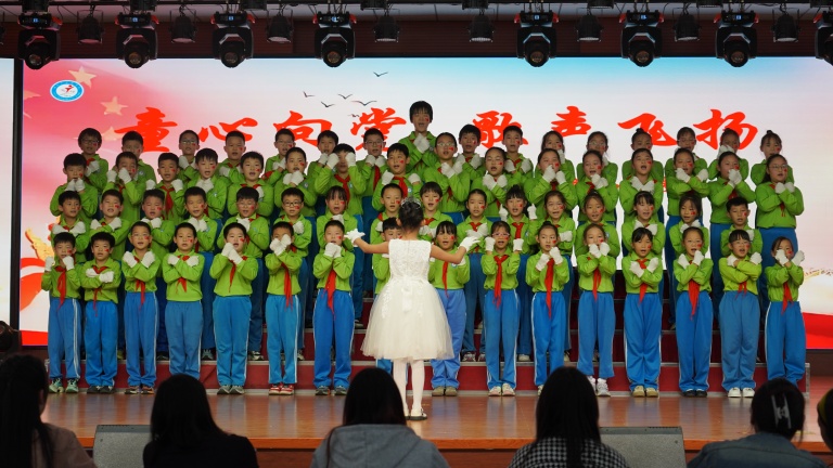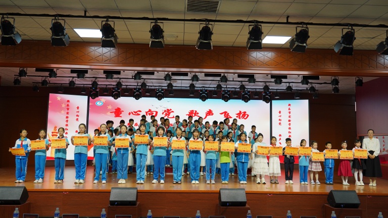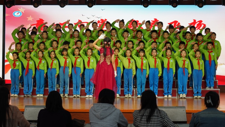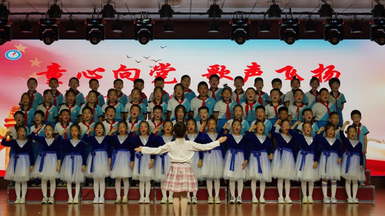五、六年级学子以必选曲目《没有共产党就没有新中国》拉开序幕,歌声铿锵有力、气势昂扬;自选曲目环节,《中华少年》《国家》《卢沟谣》等歌曲轮番唱响,学子们精神饱满、眼神坚定,整齐的服装与默契的配合赢得现场阵阵掌声。