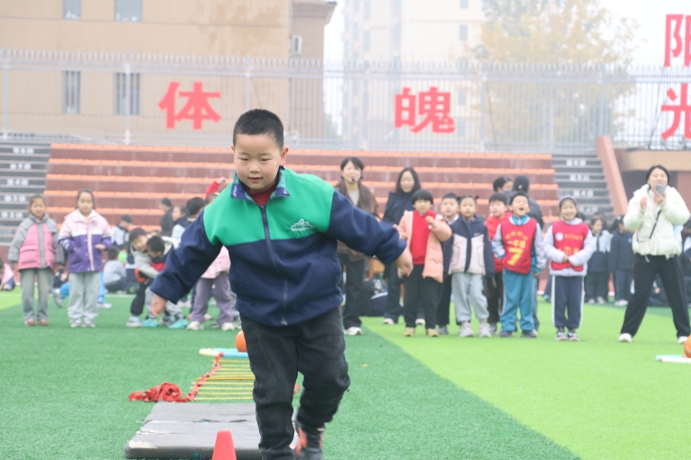 比赛哨声一响,选手们立刻投入状态。夹球跑时,他们将篮球紧紧夹在两腿之间,迅速冲出起点线;跳绳梯上,他们双脚轻快交替,节奏丝毫不乱;绕桩跑环节,选手们灵活侧身避让,几乎没碰倒一根桩;爬行前进时,选手们手脚并用,你追我赶,互不相让。