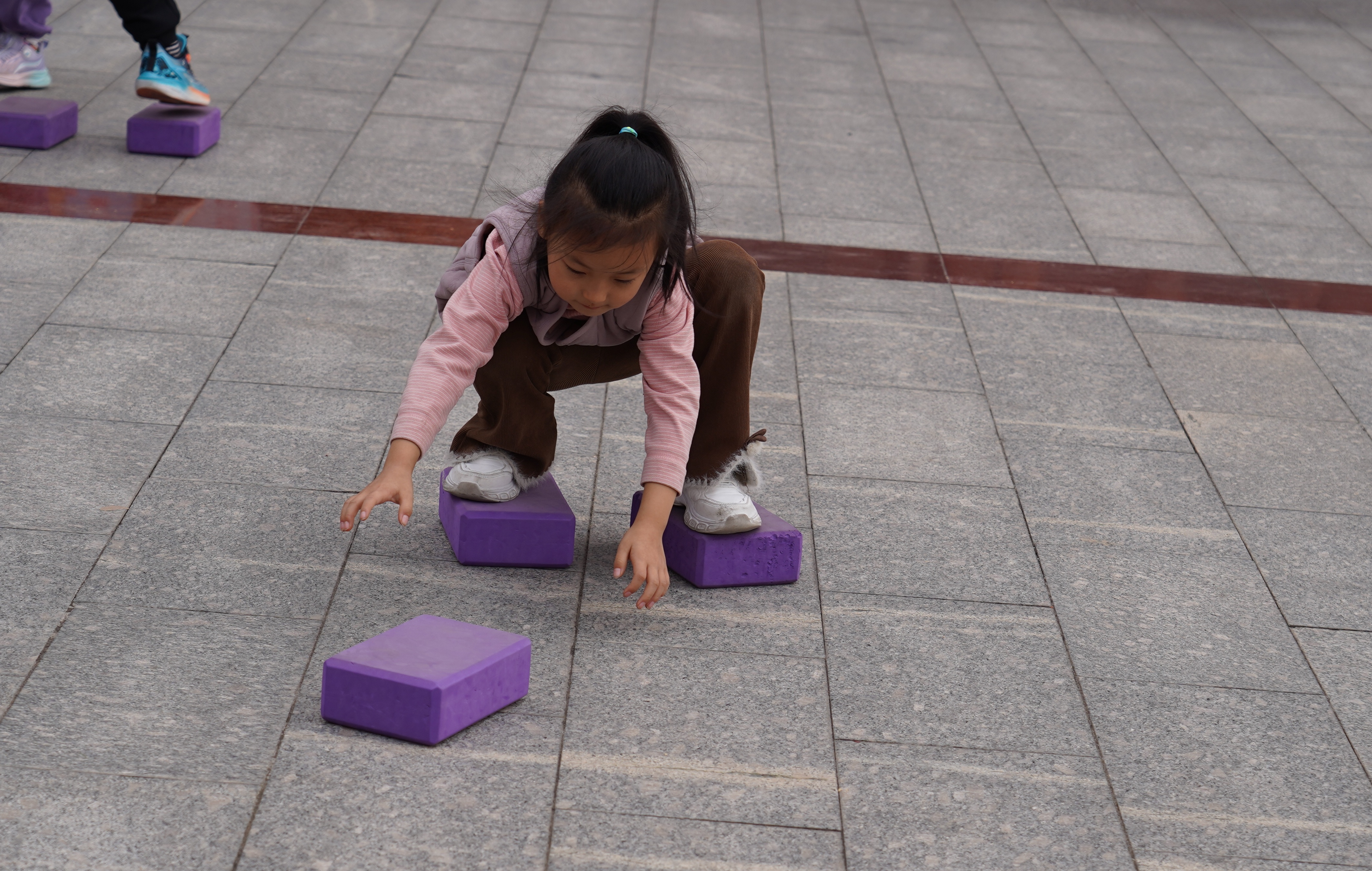 “摸石过河” 需要选手踩着三块泡沫板 “过河”,手脚并用移动泡沫板,脚不能接触地面。瞧!孩子们像小螃蟹一样横着挪动,手脚那叫一个忙活。有的摇摇晃晃差点“落水”,惊得大家直喊“小心”!每成功一步,场边就响起一片叫好声,可热闹啦!