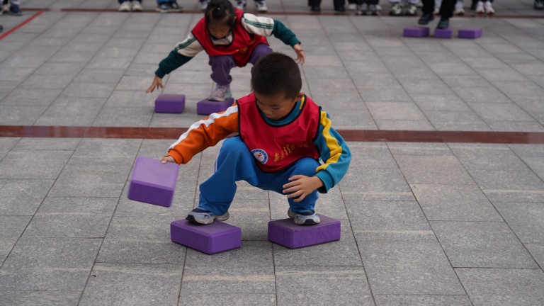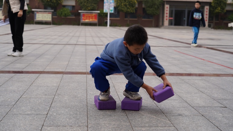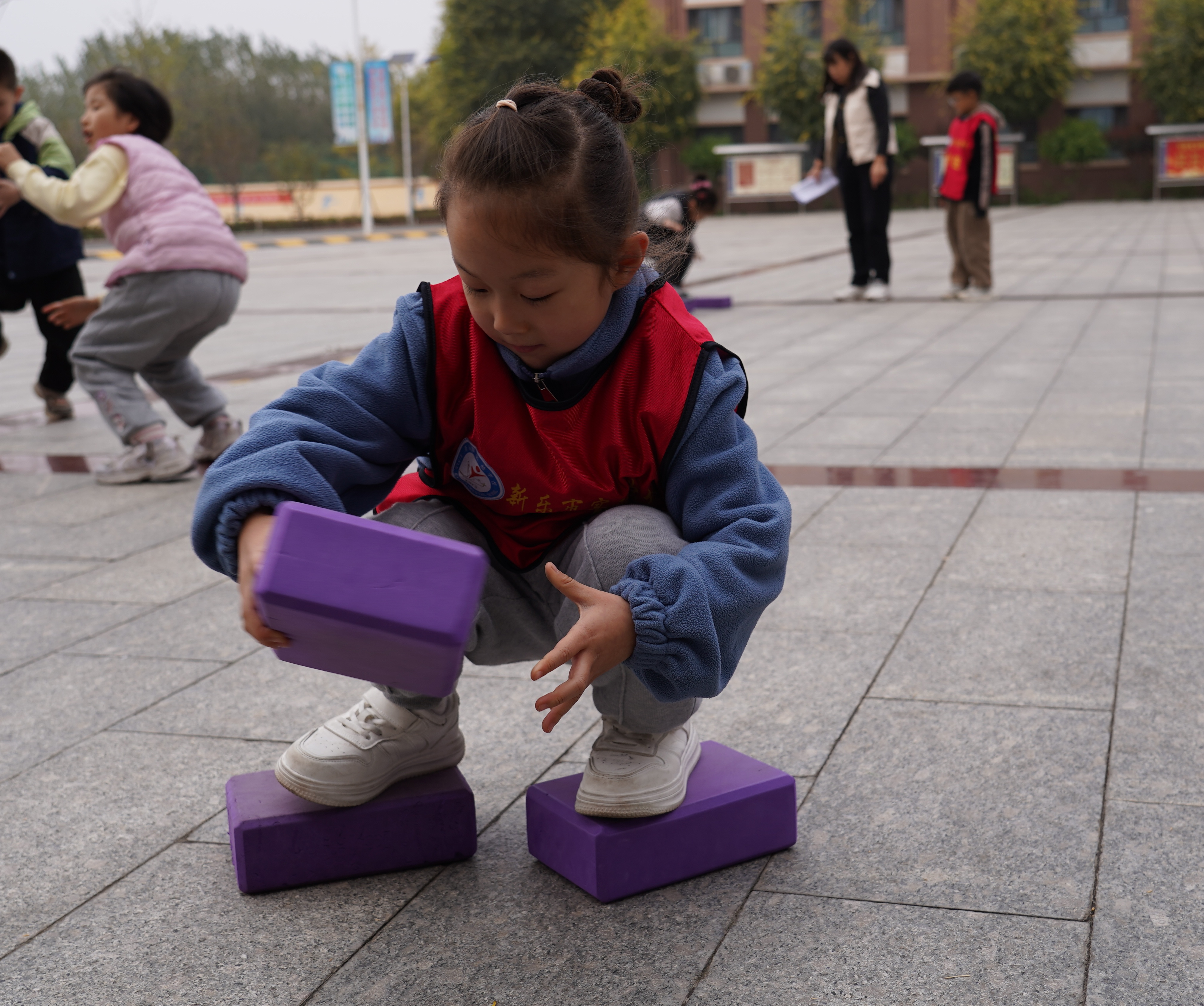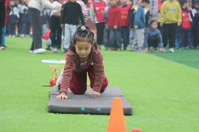 “翻山越岭” 项目设置了夹球跑、跳绳梯、绕桩跑、爬行前进四道关卡,考验学生的速度与力量。