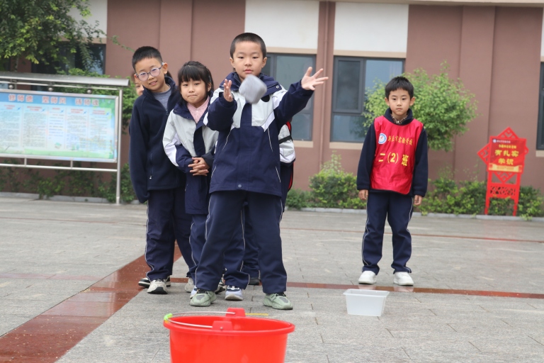 沙包投准项目看似简单,实则考验手感与专注力。瞧!小选手们个个全神贯注,紧盯目标。只见他们小手一扬,沙包“嗖”地飞向小桶——进啦!场边顿时爆发出阵阵欢呼。每投进一个,小选手就开心得直跳,老师和同学们更是齐声喝彩,整个场地都沸腾了!