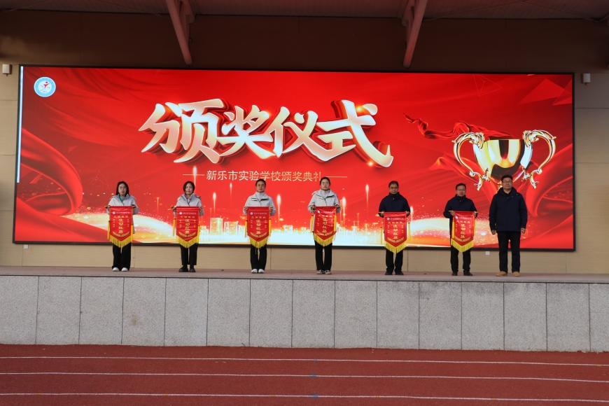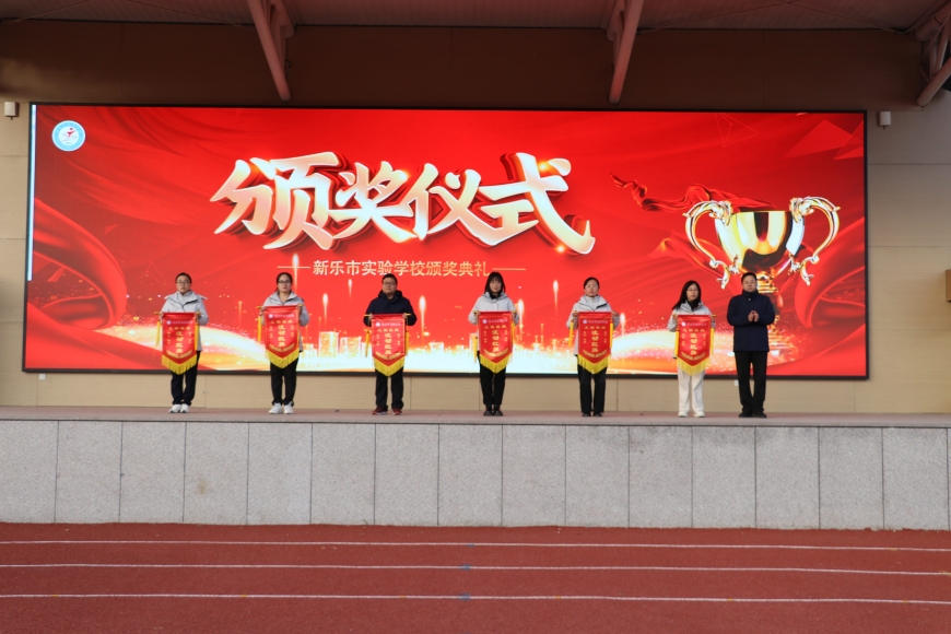 党支部书记、校长郝月强为九年级获奖班级颁发流动红旗。九年级获奖班级有:20班, 13班, 14班, 17班, 6班, 8班。