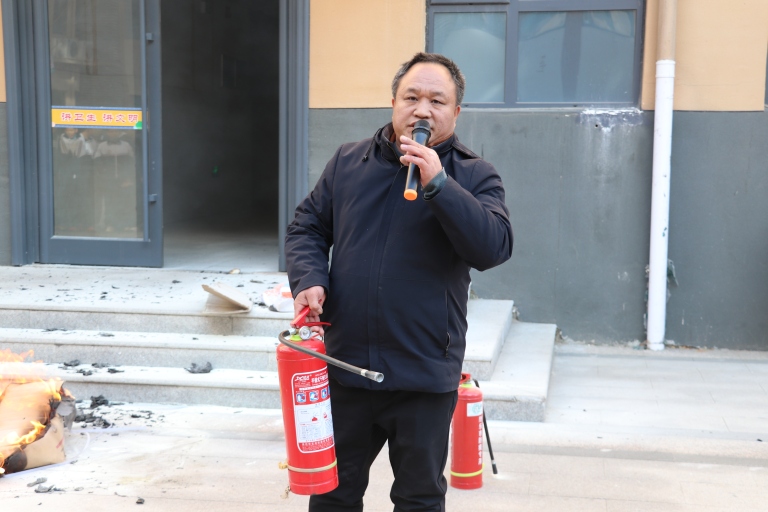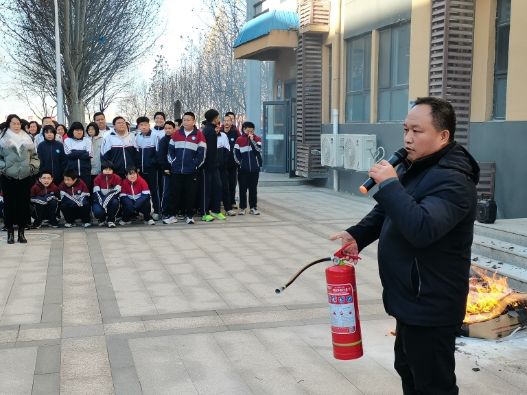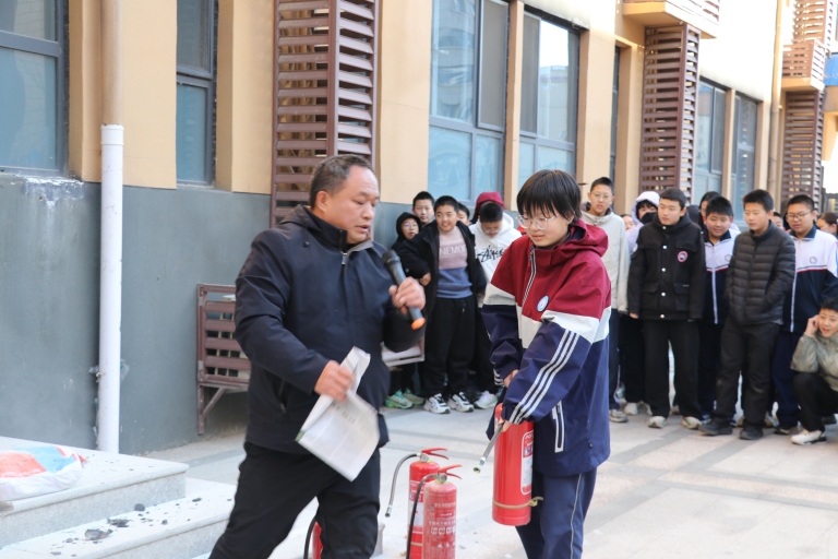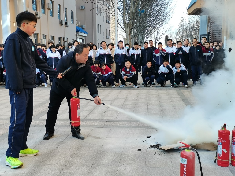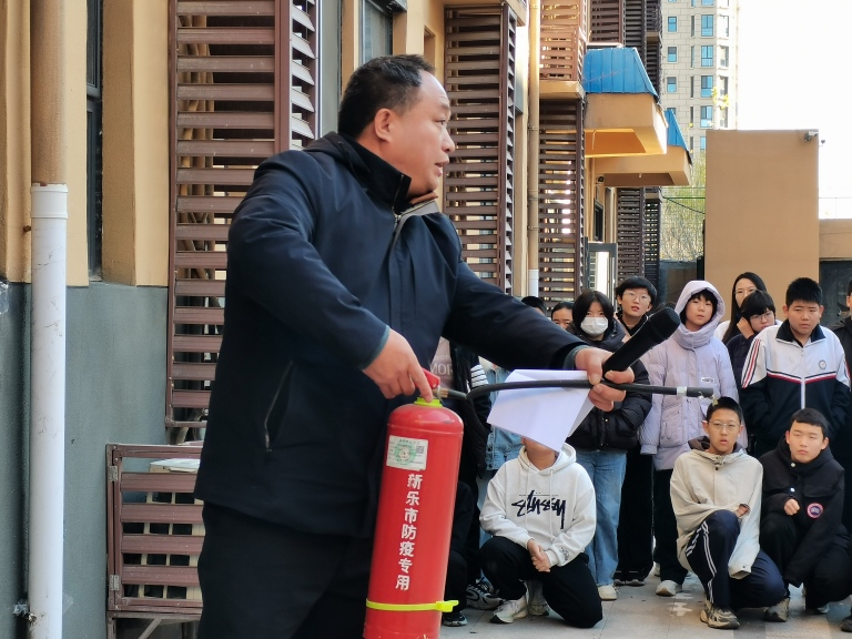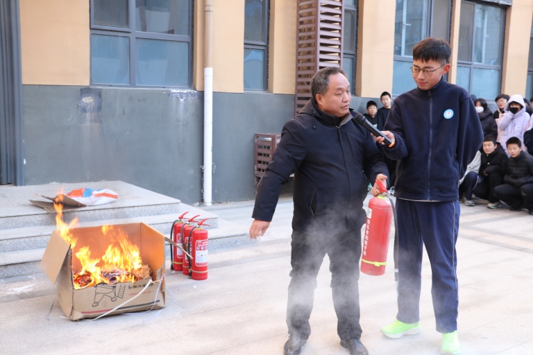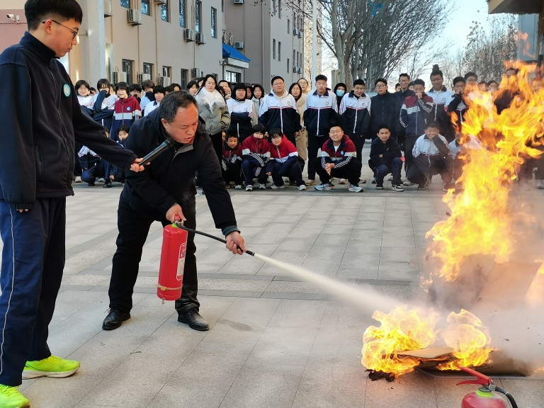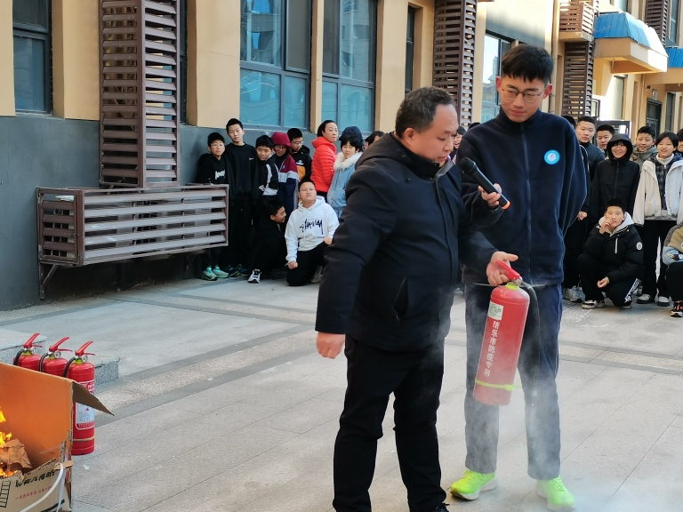 在互动环节,通过场景模拟,政教主任安英辉教授灭火器的“提、拔、握、压”四步操作法,让师生们直观掌握灭火关键技能。
