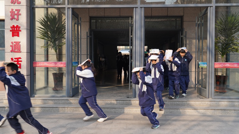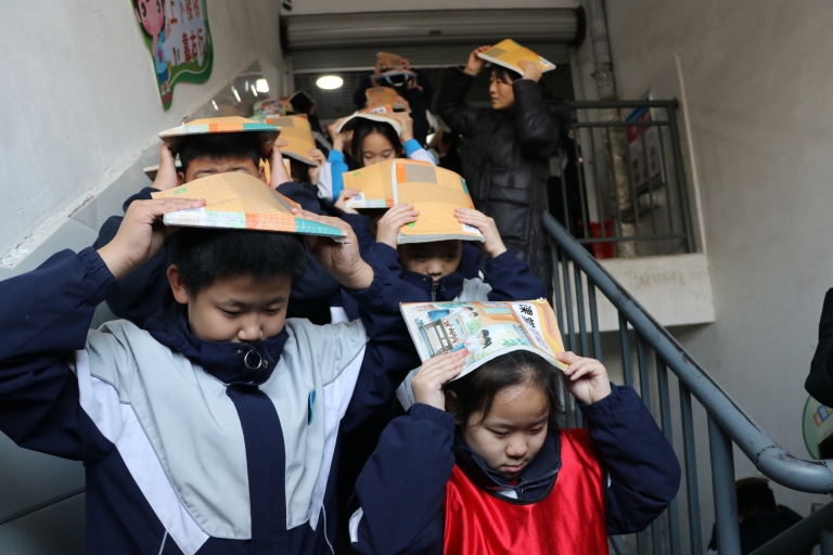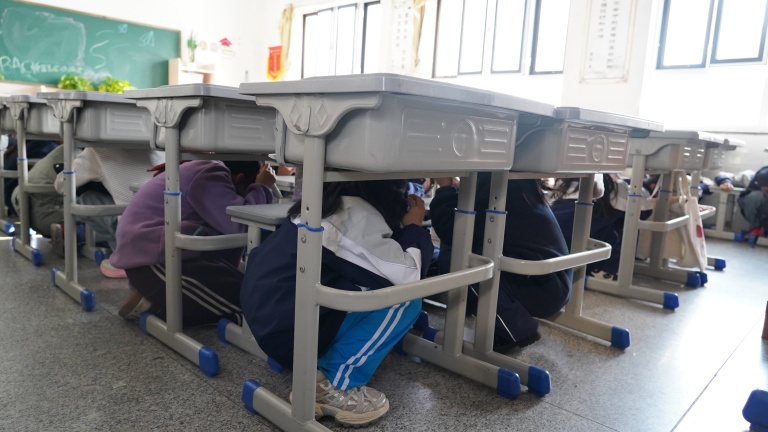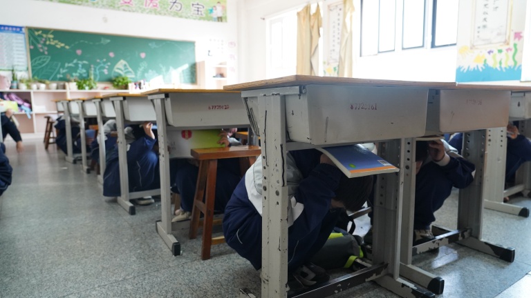 下午2点10分,随着第一声警报声响起,防震应急演练正式开始。全体学生在老师的指挥下迅速躲在课桌下,用书本护住头部,尽量蜷曲身体,降低身体重心,整个过程紧张而有序。