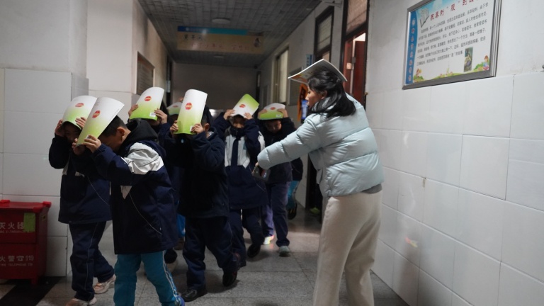 随着第二声警报声响起,各班级学生在老师的带领下,按照预定的疏散路线,迅速、有序地撤离教室。在楼梯拐角、走廊等关键位置,都有专门的老师负责引导和指挥,确保学生们安全通过。同学们用书本保护头部,弯腰低姿前行,不拥挤、不推搡,整个疏散过程快速而平稳。